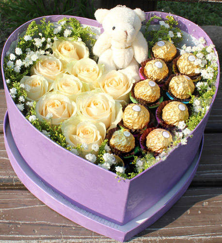 鲜花:8寸心形奶油蛋糕、外用玫瑰装饰,奶油裱花。