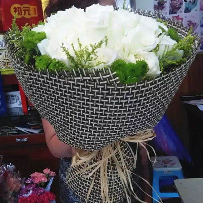 鲜花:11朵香槟玫瑰,6朵白色百合,搭配白色桔梗,尤加利叶。
