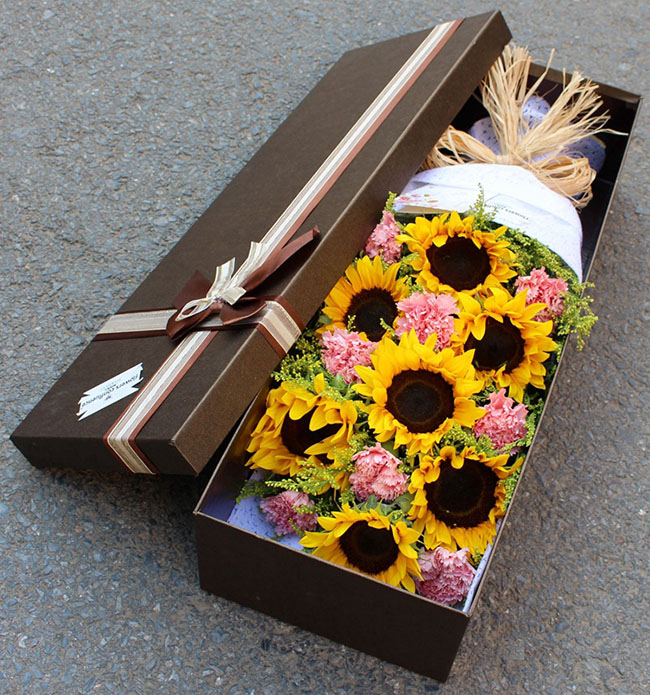 鲜花:3朵向日葵,6朵香槟玫瑰,搭配橙色泡泡玫瑰、满天星、尤加利等。