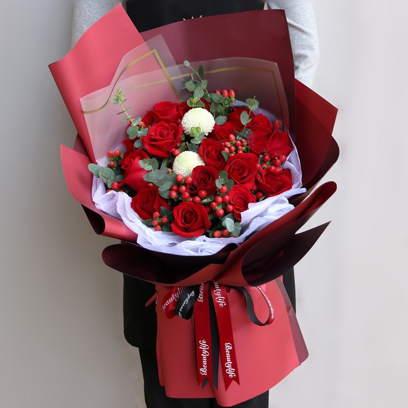 鲜花:11朵红玫瑰,搭配情人草,相思梅。